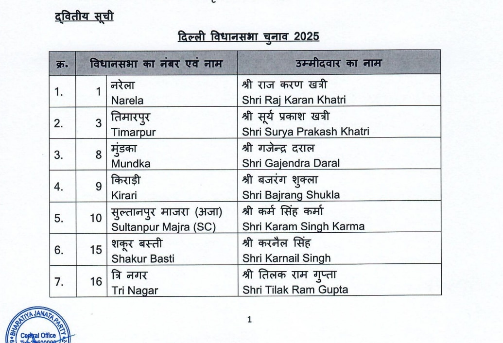 दिल्ली विधानसभा चुनाव 2025 की लिस्ट में कपिल मिश्रा (करावल नगर), राज करण खत्री (नरेला) के नाम शामिल हैं.