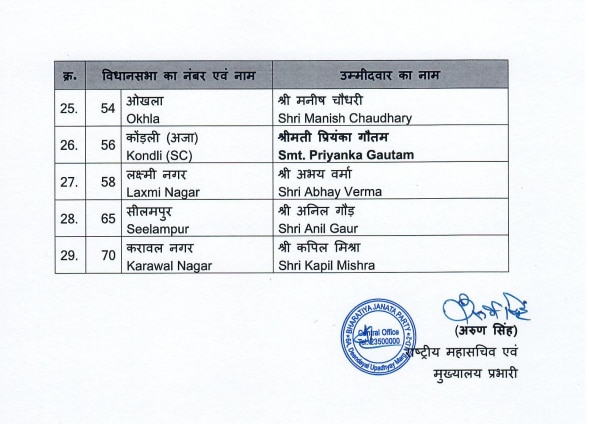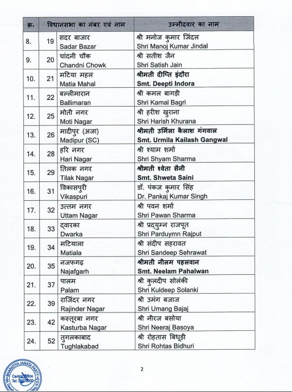 बीजेपी ने चार जनवरी को अपने 29 उम्मीदवारों की पहली लिस्ट जारी की थी जिसमें, आम आदमी पार्टी (आप) और कांग्रेस से हाल ही में पार्टी में शामिल हुए कम से कम छह दलबदलुओं को दिल्ली के चुनावी मैदान में उतारा था। बीजेपी ने नई दिल्ली सीट से आप सुप्रीमो और पूर्व मुख्यमंत्री अरविंद केजरीवाल के खिलाफ पश्चिम दिल्ली के अपने पूर्व सांसद प्रवेश वर्मा को मैदान में उतारा है, जबकि दक्षिण दिल्ली के पूर्व पार्टी सांसद रमेश बिधूड़ी को कालकाजी से सीएम आतिशी के खिलाफ मैदान में उतारा गया है, जिससे इन सीटों पर हाई-वोल्टेज, त्रिकोणीय लड़ाई देखने को मिल सकती है।